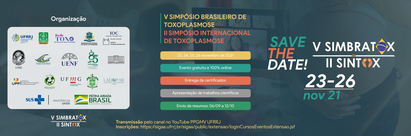 Convite: V SIMBRATOX (Simpósio Brasileiro de Toxoplasmose) e II SINTOX (Simpósio Internacional de Toxoplasmose) com o tema: "Da Saúde Única para a Saúde Pública: O futuro das políticas para a toxoplasmose". Entre 23 a 26 de novembro de 2021, em formato virtual, pelo canal do youtube PPGMV UFRRJ.