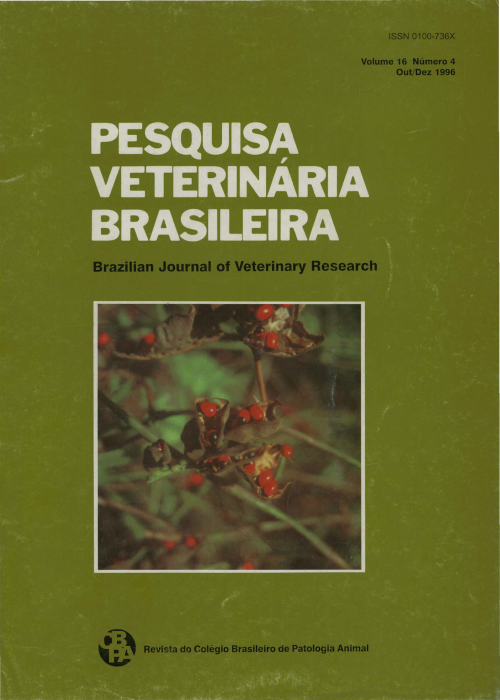 São descritos dois surtos de intoxicação por Amaranthus spp. em suínos jovens no fim do verão e início do outono, no Estado do Rio Grande do. Sul. Em ambos os estabelecimentos onde ocorreram os surtos, os suínos eram alimentados com grandes quantidades de Amaranthus spp. em frutificação, recém-colhido. Em um dos estabelecimentos o Amaranthus foi identificado como A. viridis. No estabelecimento 1, morreram 14 suínos de um lote de 25 (56%) e no estabelecimento 2 morreram 17 de um total de 100 suínos (17%). Os sinais clínicos incluíam anorexia, apatia, andar incoordenado, rigidez muscular, decúbito lateral e morte, que ocorria de 4 a 48 horas após a observação dos sinais clínicos. Os achados de necropsia incluíam edema perirrenal e edemas em vários outros locais, como ascite, hidrotórax, hidropericárdio, mesentério e tecido subcutâneo da parede abdominal ventral. Os rins estavam pálidos e macios, com petéquias na superfície subcapsular. Em um caso havia marcado edema das papilas renais. Os principais achados histopatológicos foram nefrose tubular tóxica afetando principalmente os túbulos contorcidos proximais e regeneração tubular discreta. Em um dos três casos foram observados cristais refringentes na luz dos túbulos proximais e, em dois casos, as lesões renais degenerativas estavam associadas a moderado inflitrado mononuclear intersticial. Lesões extra-renais consistindo de glossite e esofagite fibrinonecróticas foram encontradas em um suíno e atribuídas à uremia.