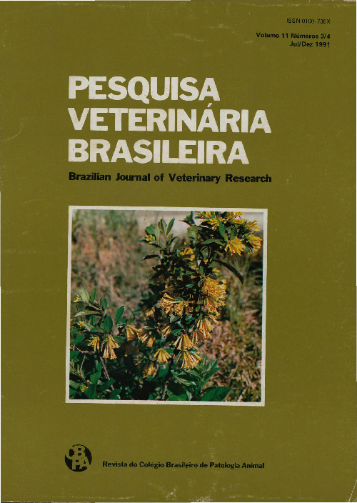 Uma doença com quadro clínico-patológico de insuficiência hepática aguda foi estudada em bovinos, no estado de Santa Catarina. O quadro clínico manifestado pelos animais doentes caracterizava-se principalmente por anorexia, apatia, atonia de rume, fezes pastosas e escuras, salivação, globo ocular retraído, tremores musculares. Os animais mantinham a cabeça baixa ou apoiada em obstáculos e mostravam andar cambaleante. A morte ocorria entre 8 à 12 horas após o início dos sintomas. À necropsia de 4 bovinos, o fígado estava levemente amarelado, ao corte observava-se aspécto de nos-moscada e havia hemorragias circulares de 0,5 à 2 mm de diâmetro sob a cápsula. Também chamavam atenção hemorragias nas serosas do rume, omaso, intestino e hemorragias no coração, principalmente no sulco coronário e no endocárdio esquerdo. Ressecamento do conteúdo do ornaso, cólon e reto foi observado em todos os casos. Os exames histológicos mostraram necrose de coagulação do parênquima hepático associada à congestão e hemorragias centrolobulares, e esteatose. Esta doença foi reproduzida experimentalmente através da administração a 11 bovinos de folhas verdes de Cestrum corymbosum var. hirsutum coletadas na região da ocorrência. Com doses únicas de 39 e 35 g/kg ou doses repetidas de 2,5 e 5 g/kg durante 14 a 23 dias, os animais adoeceram de forma aguda e morreram com sinais clínicos e lesões macro e microscópicas semelhantes às observadas nos casos naturais. Em doses únicas de 30 g/kg ocorreram sintomas clínicos com recuperação posterior, e de 20 g/kg apenas um dos dois bovinos adoeceu. A administração de 0,625 e 1,25 g/kg em dois bezerros durante 95 dias não produziu alterações clínicas e nem lesões macro e microscópicas. Conclui-se que a ingestão de C. corymbosum var. hirsutum é a causa da doença de bovinos que ocorre no Planalto Catarinense e Alto Vale do Itajai, caracterizada por insuficiência hepática aguda. Presume-se que a ingestão da planta está relacionada à fome, já que as mortes ocorrem mais no período de escassez de pasto e a doença pode se manifestar tanto em animais que ingiram doses únicas superiores a 20 g/kg ou naqueles que passam a consumir doses menores até no mínimo 2,5 g/kg, por vários dias (efeito acumulativo).