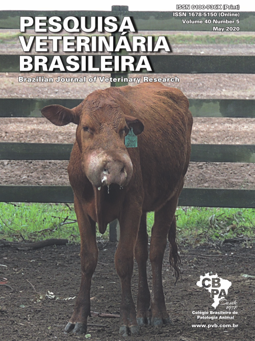 Descreve-se um surto de actinobacilose com manifestação clínica de cara de hipopótamo diagnosticado em uma propriedade localizada no município do Capão do Leão, Rio Grande do Sul em setembro de 2016. Os bovinos permaneciam durante a maior parte do ano em restevas de arroz e quando as áreas eram ocupadas com novas lavouras eram transferidos para áreas onde havia pequenas matas nativas. Foram afetados três bovinos adultos que apresentavam aumento de volume na região nasolabial e maxilar e havia, também, tumefação dos linfonodos regionais. A evolução da enfermidade era de aproximadamente seis meses. Nos fragmentos coletados para cultura houve isolamento de Actinobacillus lignieresii. O diagnóstico foi baseado nos achados clínicos, na avaliação histopatológica caracterizada pela presença de piogranulomas com reação de Splendori Hoeppli no centro, no isolamento bacteriano, identificação de Actinobacillus lignieresii por reação em cadeia da polimerase (PRC) e sequenciamento genético.