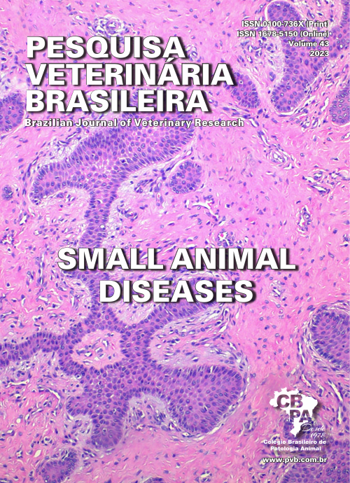 Descrevemos um surto de leishmaniose em sete cobaias (Cavia porcellus), com lesões cutâneas nodulares ulceradas de tamanhos variados observadas na cavidade nasal, lábio superior, pavilhões auriculares, vulva e região periarticular dos membros. No exame citológico foram encontrados macrófagos contendo vacúolos parasitóforos no citoplasma de aproximadamente 4.0μm em diâmetro com morfologia sugestiva de Leishmania sp. Apesar de regressão espontânea das lesões cutâneas terem ocorrido em duas das sete cobaias, apenas um sobreviveu. Seis dos sete animais afetados morreram e foram necropsiados. Macroscopicamente, todos os animais apresentaram lesões cutâneas nodulares, crostosas e sanguinolentas. Uma das cobaias tinha pulmões vermelho-escuros, distendidos e firmes. A histopatologia das lesões cutâneas revelou dermatite acantótica intersticial histiocítica associada a miríades de organismos de Leishmania no citoplasma de macrófagos. Nos pulmões as lesões eram características de pneumonia bronco-intersticial com infiltrado focal de neutrófilos, eosinófilos, macrófagos epitelioides e células gigantes multinucleadas contendo amastigotas basofílicos de 2µm com morfologia compatível com Leishmania spp. Lesões granulomatosas focais associadas ao agente no pulmão são um achado inédito na leishmaniose causada por L. enriettii em cobaias. A técnica de reação em cadeia da polimerase (PCR) com primer mini-exon realizada em amostras de lesões de duas cobaias afetadas foi positiva, identificando Leishmania enriettii. Os aspectos macroscópicos, citológicos, e histológicos associados à técnica da (PCR), permitiram o diagnóstico da leishmaniose e a identificação da espécie L. enriettii.