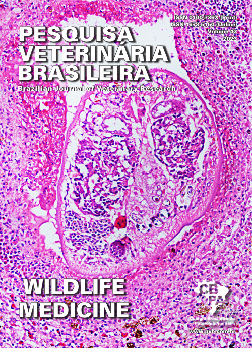 Descrevem-se as características epidemiológicas, clínicas e patológicas de dois surtos de infecção ocular pelo trematódeo Philophthalmus sp. em avestruzes ocorridos nos estados do Ceará e Rio Grande do Norte no Nordeste do Brasil. As propriedades tinham em comum, a criação semi-intensiva e livre acesso a açude e rio. Os sinais clínicos incluíam protrusão da membrana nictante, lacrimejamento, edema palpebral, congestão ocular, destruição do globo ocular, emagrecimento e morte. A evolução clínica variou de oito a 16 meses. Macroscopicamente, observou-se espessamento das pálpebras e conjuntivas associado a numerosas estruturas parasitárias alaranjadas. No segundo surto, as lesões eram mais graves e consistiam em perda do globo ocular direito e anexos. Histologicamente, as lesões caracterizavam-se por conjuntivite linfoplasmocítica e heterofílica, multifocal a coalescente, moderada, crônica associada a hiperplasia e ectasia da glândula de Harderian e numerosas estruturas parasitárias. Os parasitas eram ovalados, achatados com ventosa oral e acetábulo e cutícula espessa contendo espículas. O diagnóstico de filoftalmíase foi realizado com base nos achados epidemiológicos, clínicos e patológicos associadas as características morfológicas dos parasitas presentes nos sacos conjuntivais compatíveis com o trematódeo Philophthalmus sp. A filoftalmíase pode ocorrer em avestruzes criados em propriedades urbanas e rurais no Nordeste do Brasil, provavelmente associado ao contato das aves com água contaminada e caracteriza-se por quadros de conjuntivite grave que pode resultar com a perda do globo ocular e morte dos animais.
